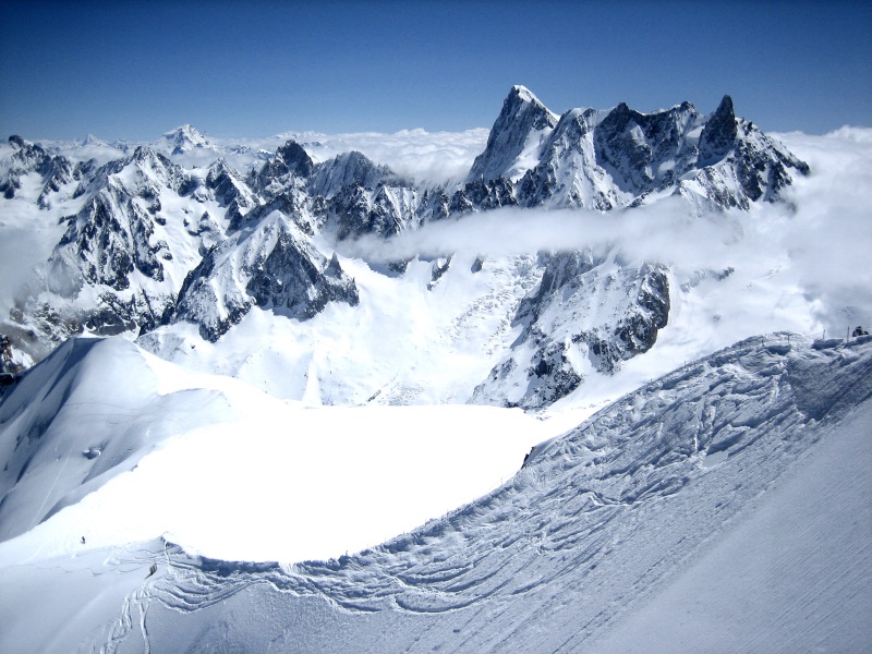 Famous alps, well-known among climbers. Right to left: Dent du Geant, Grand Jorasses, Aiguille du Grepon, Grands Charmoz, Les Drus.