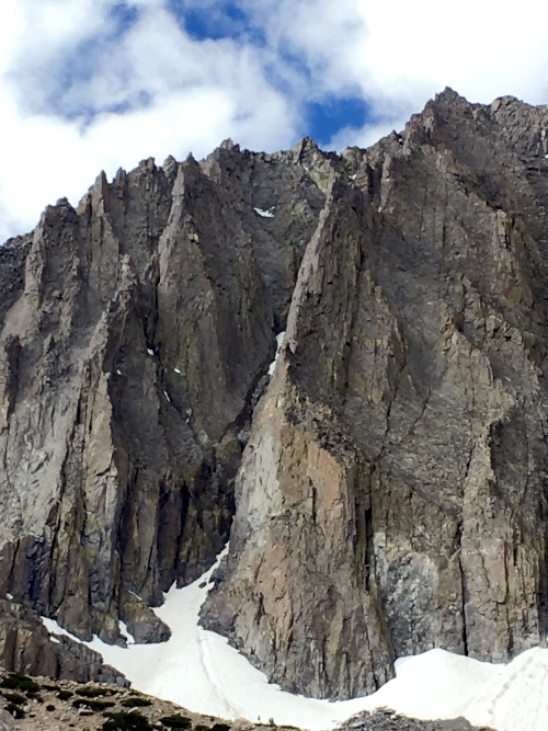 This was a climb that I have been wanting to do for many years, but it is one of the longest in the Sierra and particularly committing. It is the prominent arete and serrated ridge to the summit in the center above the snow field. (Moon Goddess Arete, across the gap to the left, was actually my first big alpine route 20-some years ago, but that is a different story....)
