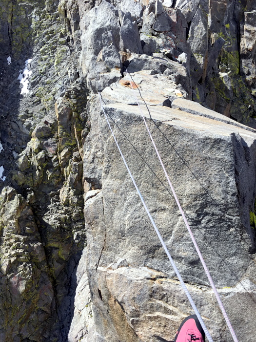 This route has a Tyrolean traverse. First, lasso the block on the other side (after several failed attempts, we now know how best to do that), then loop the rope through an old ring angle piton and cinch it up as tight as possible. Clip your harness to the rope and haul yourself across the gap from one tower to another. Finally, pull the knot over, untie it, and recover the rope.